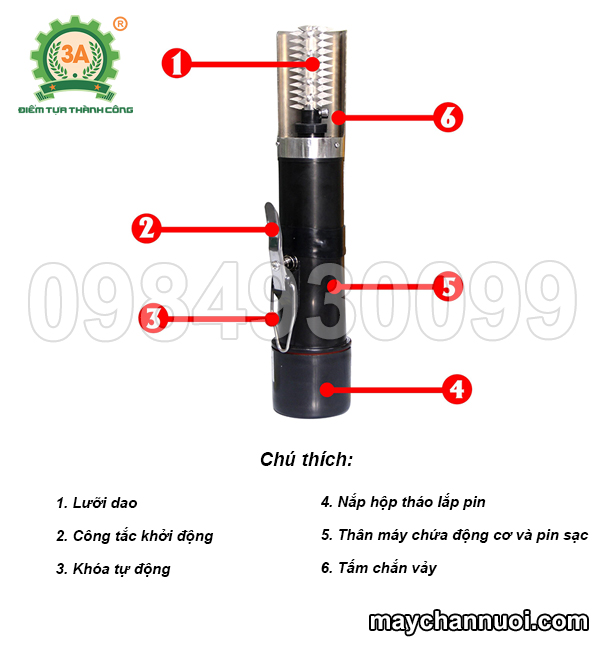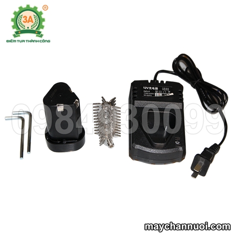 1. Lục giác tháo mở dao - 2. Pin dự phòng - 3. Lưỡi dao dự phòng - 4. Dây sạc