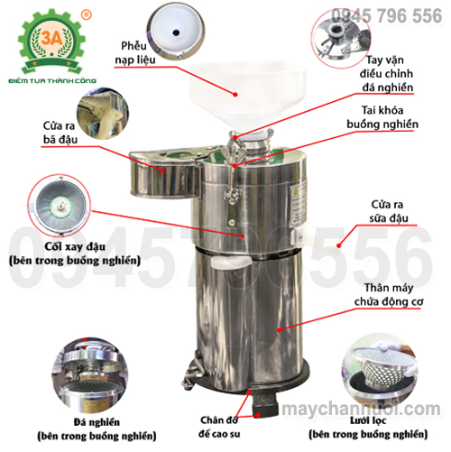 Máy xay sữa đậu nành 3A sử dụng motor với công suất đạt 370W, tốc độ trục chính là 2800 vòng/phút. Máy xay được với hiệu suất 15kg/h, có thể đáp ứng được nhu cầu sử dụng của các hộ gia đình cho tới các cơ sở kinh doanh.