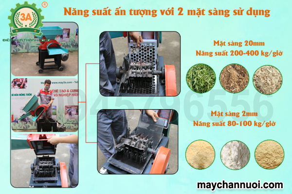 Máy sử dụng nguồn điện 3 pha và gắn động cơ có công suất 3kW. Do vậy, máy có thể làm việc liên tục trong vòng nhiều giờ mà vẫn đảm bảo tốc độ băm, nghiền ổn định. Chỉ trong thời gian ngắn, bà con đã có thể băm hàng trăm kilogam phụ phẩm nông nghiệp mà không tốn quá nhiều công sức, chi phí thuê nhân công. Năng suất của máy còn tùy theo mặt sàng, mục đích sử dụng và tình trạng nguyên liệu.