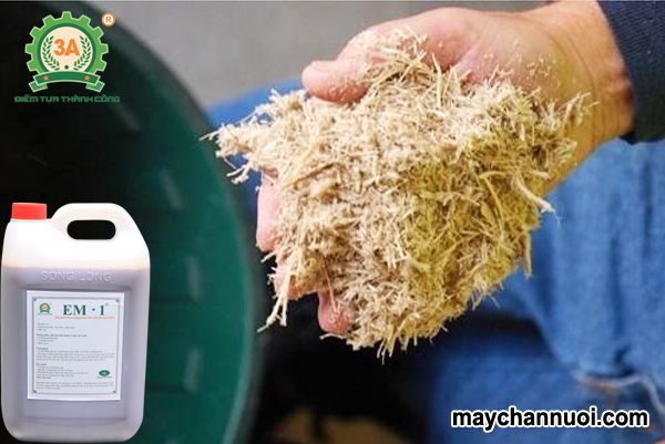 Bước 3: Pha loãng chế phẩm EM1 theo tỉ lệ đã được hướng dẫn trên bao bì rồi tưới đều nó lên lớp nguyên liệu đã được dàn mỏng. Tiếp tục lặp đi lặp lại cho đến khi nào hết nguyên liệu và tạo thành đống ủ cao khoảng chừng 1.5 đến 2m là được.