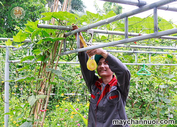 Ngoài ra, bà con dùng dụng cụ buộc cành cây 3A để buộc các nhánh và ngọn cho cây bí đao được bám chặt vào giàn tránh khỏi bị gãy.