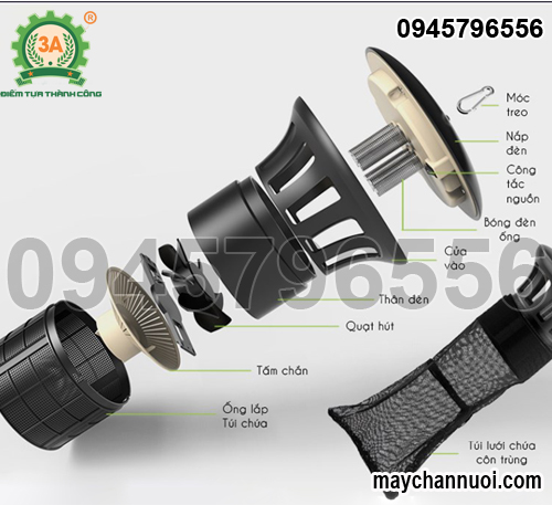 Đèn diệt côn trùng 3A được thiết kế gọn nhẹ, có trang bị móc treo, giúp dễ dàng cố định vị trí tại những địa điểm bất kỳ. Bên cạnh đó, các thao tác sử dụng và vệ sinh đèn cũng rất dễ dàng. Sau khi túi lưới chứa nhiều xác côn trùng, chỉ cần nhẹ nhàng tháo ra và vệ sinh bên trong và gắn lại như ban đầu. Với các bộ phận chính như sau: