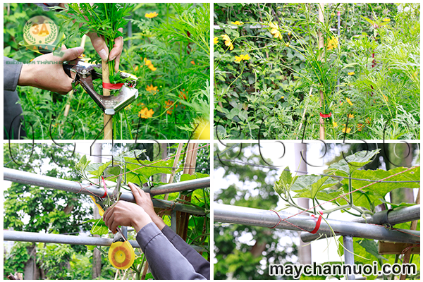 Dùng máy cắt tỉa cành cầm tay và ghim các loại cành lá giúp thân cây cà pháo được vững chắc hơn.