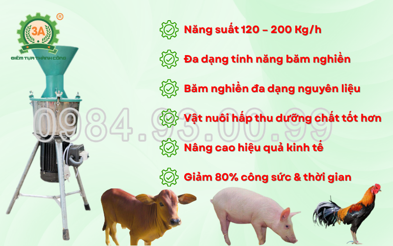 Máy băm nghiền đa năng 3A giúp giảm chi phí thức ăn 30-50% nhờ tận dụng phụ phẩm nông nghiệp. Thức ăn chất lượng cao giúp vật nuôi tăng cân nhanh, giảm bệnh tật, từ đó tăng lợi nhuận.