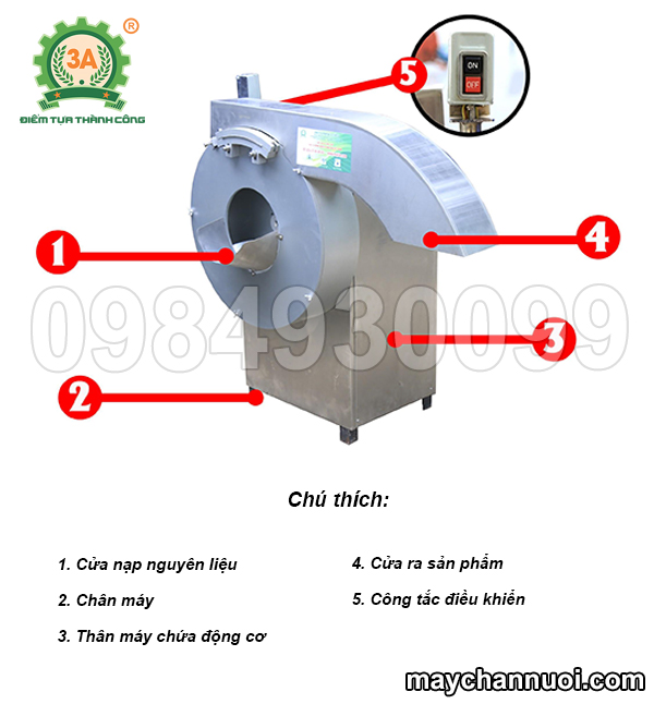 Máy cắt rau củ dạng sợi 3A1,1Kw được cấu tạo bởi một buồng thái củ quả, thực hiện quá trình cắt thái bởi lực ly tâm. Củ quả sau đi được cho vào cửa nạp nguyên liệu sẽ được đưa xuống buồng cắt thái. Tại đây, củ quả được quay theo lực ly tâm và được đẩy vào lưỡi dao, thái thành lát và đi ra ngoài. Thành phẩm có được là các lát hoặc sợi củ quả, tùy vào chế độ người dùng lựa chọn.