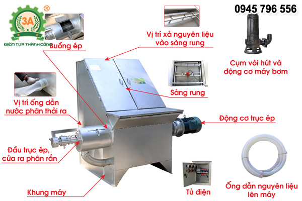 Trong chăn nuôi việc xử lý chất thải là vấn đề mà người chăn nuôi phải trăn trở làm sao để giải quyết lượng chất thải ô nhiễm. Để giúp người chăn nuôi biến nguồn phân thải thành phân hữu cơ hữu ích cho cây trồng. Công ty CPĐT Tuấn tú đã chế tạo ra Máy ép phân chăn nuôi 3A7kW dùng để ép tách nước ra khỏi hỗn hợp chất thải chăn nuôi từ phân tươi, nước tiểu, nước rửa chuồng,... giúp thu hồi lại lượng chất rắn (bã) để làm phân hữu cơ sinh học rất hiệu quả. Từ nguồn phân bón hữu cơ không bị bỏ phí này, bà con có thể tận dụng làm phân bón cho cây trồng hoặc bán ra thị trường đem thu nhập đáng kể, góp phần tăng hiệu quả sản xuất.
