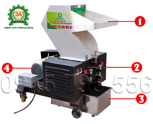 Chú thích ảnh: 1 -Phễu nạp; 2 - Buồng băm; 3 - Thùng chứa sản phẩm đầu ra; 4 - Động cơ