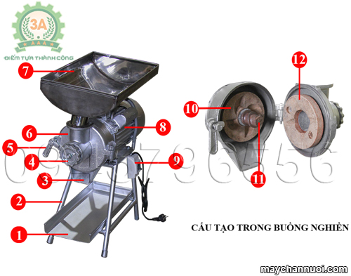 7 Khay nạp liệu 8.Động cơ 9.Aptomat 10.Đá nghiền động 11. Trục xoắn 12. Đá nghiền tĩnh  |
