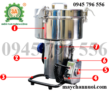 Máy xay thuốc bắc 3A2,5Kg bao gồm các bộ phận chính như sau: Thùng nghiền (thùng đựng bột), khung máy (có gắn với thân máy bao gồm động cơ), núm xoay điều chỉnh thời gian nghiền, chốt khóa thân máy.